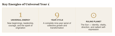 A Universal Year 1 marks the beginning of a new nine-year numerological cycle for collective humanity. It is calculated by reducing the calendar year to a single digit (2+0+2+6=10, 1+0=1). The energy of Year 1 is associated with new beginnings, fresh starts, leadership, and the planting of long-term seeds.